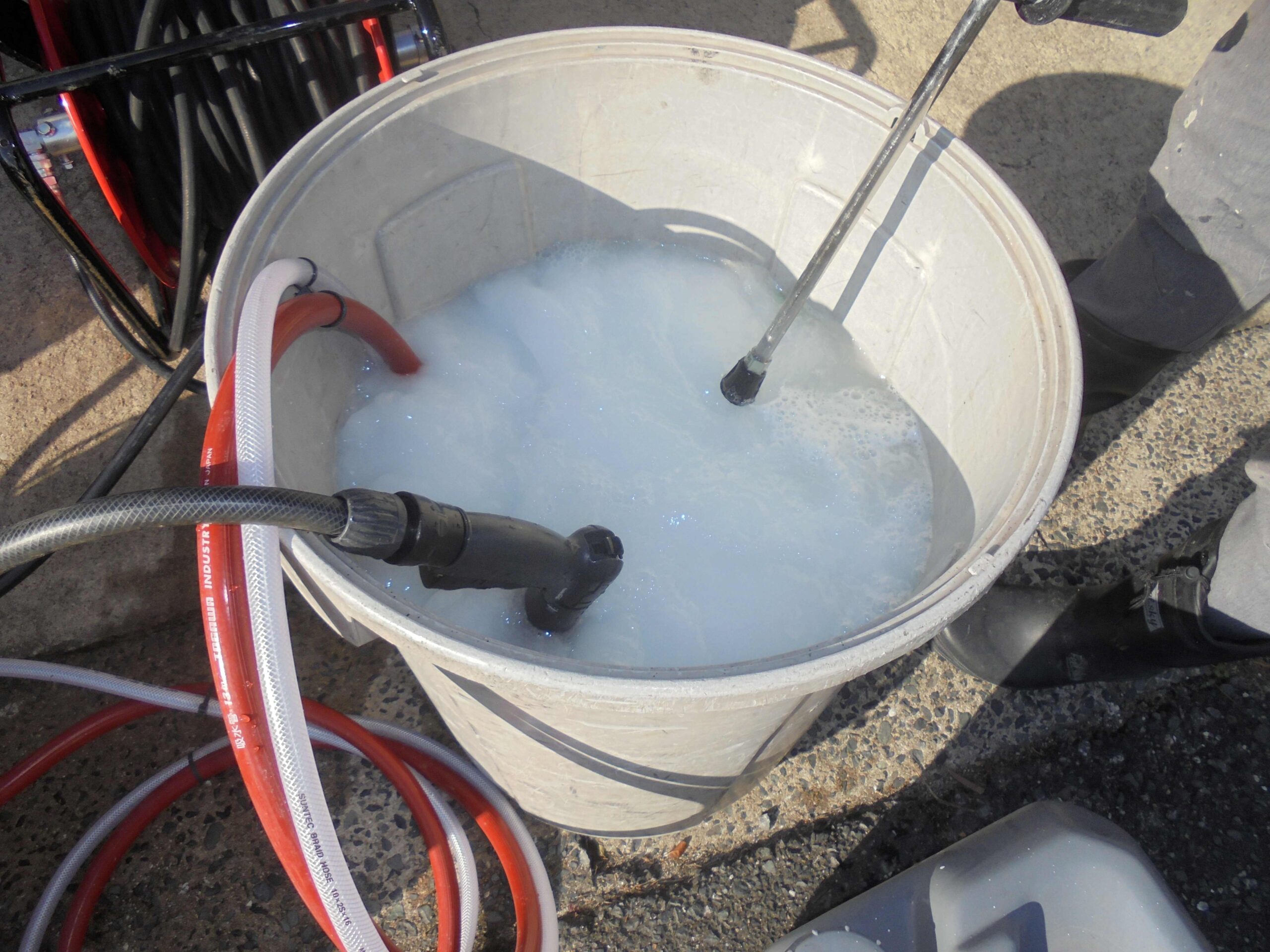 パワークリーナにて洗浄を行います。次亜塩素酸ナトリウムが含まれており、カビやコケが付き難い洗浄剤です。