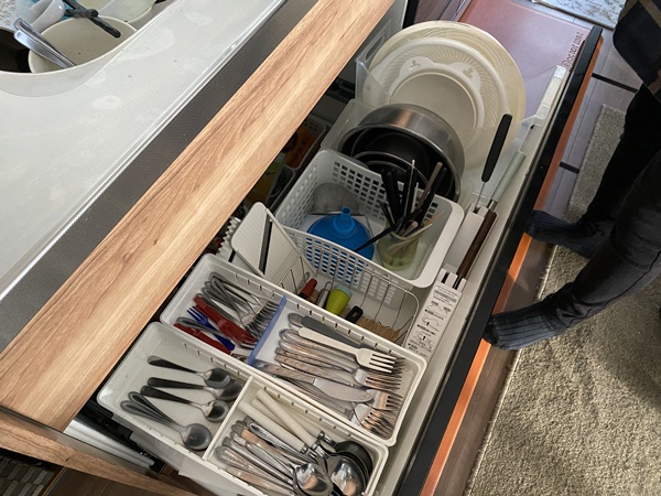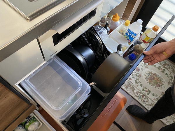 食洗器下 食洗器の水道配管が奥にあるためここは他の引出より奥行が小さくなっています。