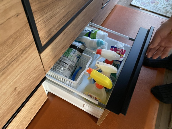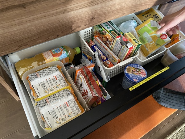 シンク下足元 電子レンジ・冷蔵庫にも近いこちらの引出には常温食品を(^^)