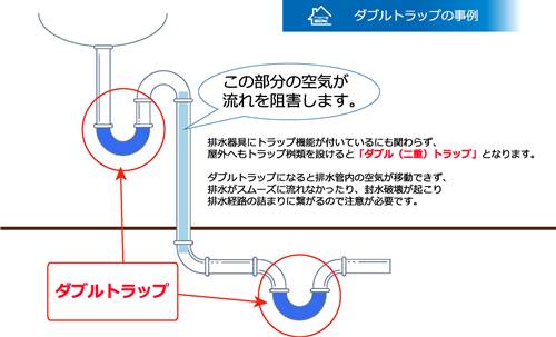 ダブルトラップとは、設備機器から排水枡までの間にトラップを2箇所以上設けてしまうことをいいます。封水が2箇所になると、封水と封水との間に空気が残りうまく抜けずに排水トラブルになってしまいます。