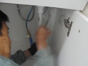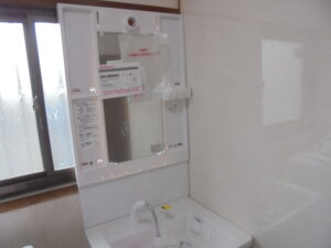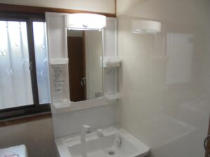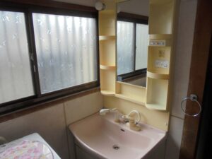 施工前の状態です。洗濯機と洗面化粧台の間が狭く使い辛いとの事で向きを替える事にしました。