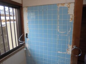 洗面化粧台を撤去した状態です。既存のタイルが出てきたのでパネルを貼ります。