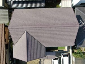 ドローンを飛ばし、屋根を上空から撮影して状態を確認します。外壁も同様、ハシゴを架けずドローンで全体の状態を確認します。