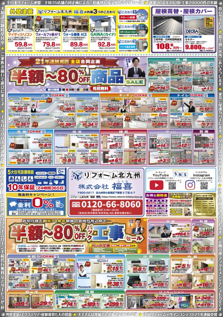 チラシとホームページ限定の特別商品や、半額~最大80%OFFのお得な商品・工事パックなども多数ご用意しております!