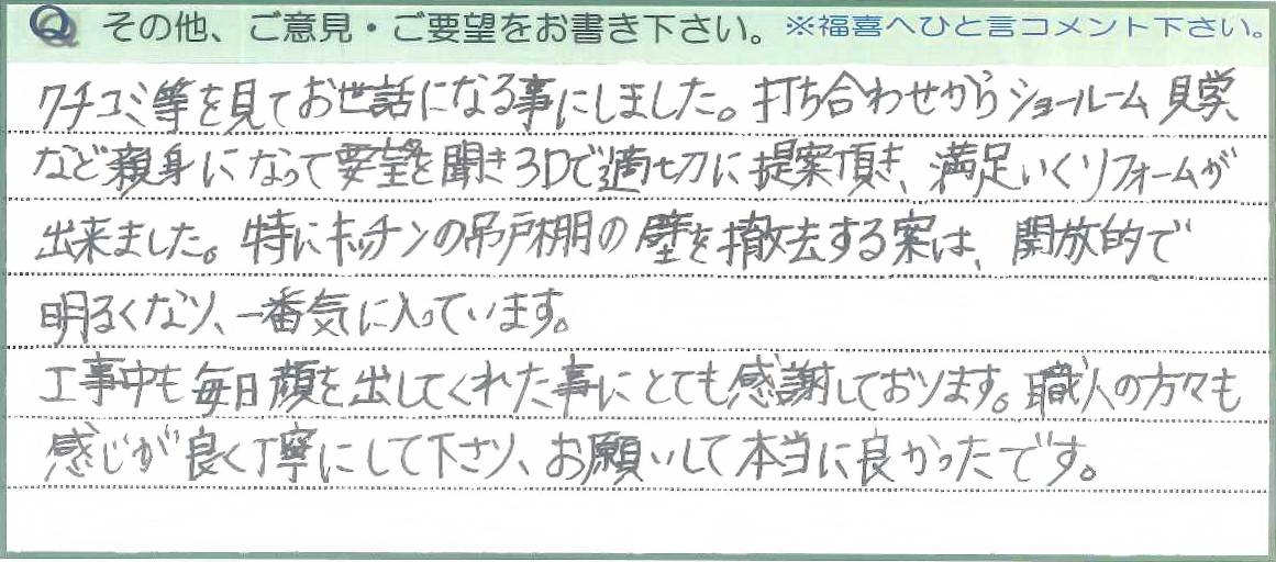 北九州市小倉南区 中村様の声 3Dで適切に提案頂き、満足いくリフォームが出来ました。 令和7年10月5日 直筆のコメント お客様から嬉しい声をいただきました クチコミ等を見てお世話になる事にしました。打ち合わせからショールーム見学など、親身になって要望を聞き3Dで適切に提案頂き、満足いくリフォームが出来ました。特に、キッチンの吊り戸棚の壁を撤去する案は、開放的で明るくなり、一番気に入っています。工事中も毎日顔を出してくれた事にとても感謝しております。職人の方々も感じが良く丁寧にして下さり、お願いして本当に良かったです。 ORDER このお客様の施工内容 家族みんなが使いやすく安心して過ごせる水廻りと快適空間♪ 浴室キッチン洗面トイレ北九州市の事例 前の記事 一覧へ戻る