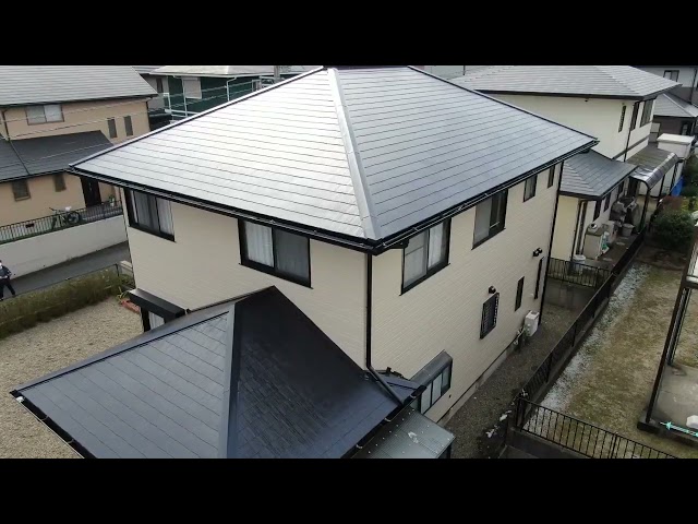 ドローン点検の結果、屋根は表面の塗膜が剥がれ、コケやカビが生えていました。外壁も、表面の塗膜効果が薄れてチョーキングが確認出来ました。屋根は塗装で、外壁は長く持ち保証が付く塗料を希望された為、美観保証10年が付くフッ素4FⅡを提案しました。色は、劇的に変えるというよりも、シンプルで見た目がキレイな色を選択しました。