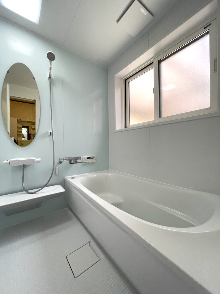 お客様のご要望に合うTOTOサザナを提案しました。鏡は、Nタイプの中でも出来るだけ高さが取れる楕円ミラーを提案し、デザイン性がアップしました。また、ご希望の浴槽水栓を取り付け、不要なものは省き、シンプルな仕様でも清掃性に優れた、使い勝手の良い浴室になりました。