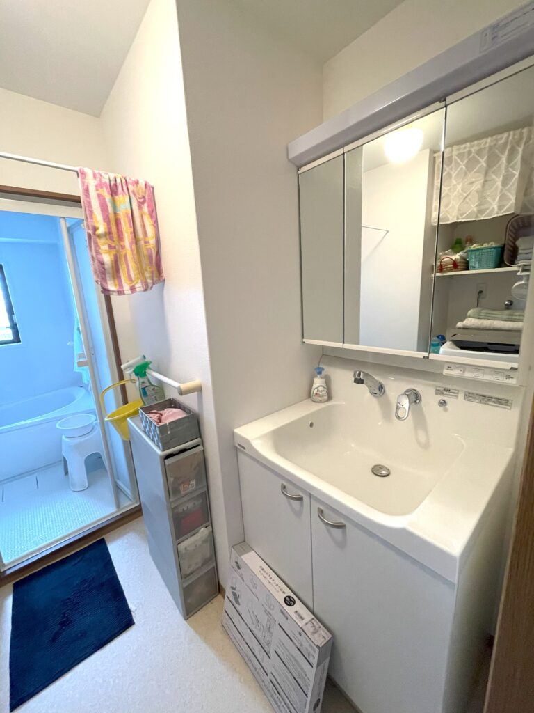 洗面化粧台はトクラスEJをご提案。三面鏡になり収納力が増えたので鏡廻りがスッキリし、ボウル部分も広くなり使いやすくなりました。