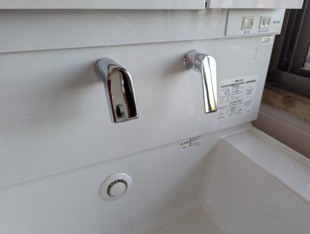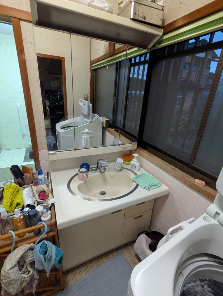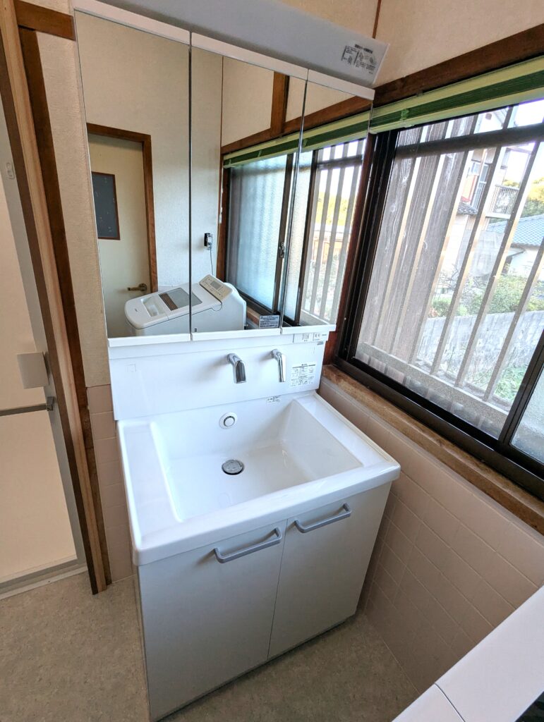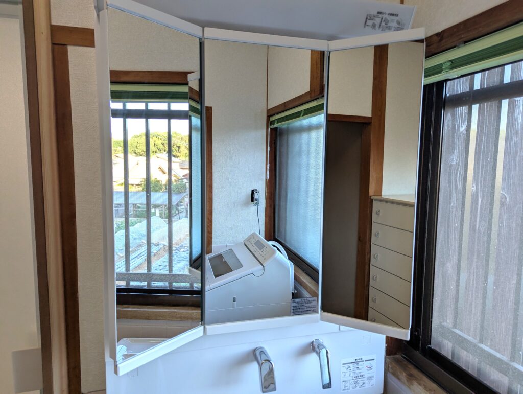 洗面化粧台も、ボウル部分が狭く使いづらい様子でした。新しく取り付けたTOTOサクアは、陶器でボウル部分が広く、サイドにも物を置くスペースがあり使いやすくなりました。三面鏡は合わせ鏡になっているので様々な用途で利用できます。