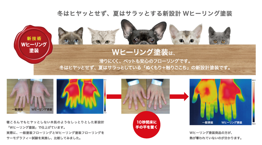 フローリングは、ペットに配慮した東洋テックスのダイヤモンドフロア キャンバスを使用。衝撃吸収力が高く、滑りにくいのと傷にも強いので猫ちゃんにも安心です。Wヒーリング塗装で、冬はヒヤッとせず夏はサラッとする新設計になっています。大切なペットにも配慮され、お部屋の雰囲気も明るくなりました。