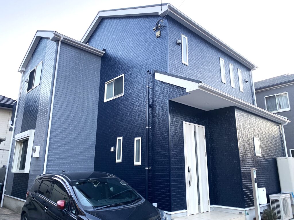 元々ツートンのサイディングになっていた為、今回もツートンでお打合せをしました。ツートンの明暗を反対にし、全体を濃い紺色、アクセントにライトグレーを配色する提案をしました。玄関の色と付帯部分ともマッチしています。塗料はできるだけ長くメンテナンス不要で済むように、期待耐侯年数15年の無機ACEを使用し、塗膜保証も10年付いています。